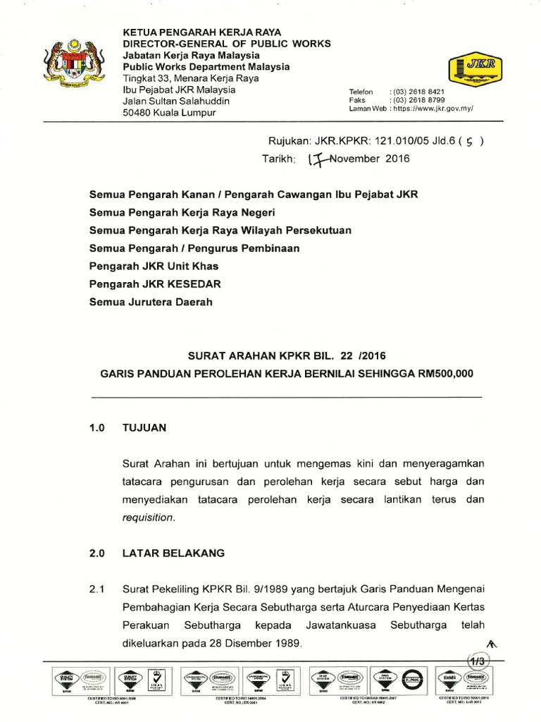 Garis Panduan Perolehan Kerja Bernilai Sehingga RM500000 bertarikh 17 November 2016 boleh diterima pakai sebagai asas penilaian sebut harga kerja. Iv Surat Arahan KPKR Bil172015 - Pelaksanaan Skim Penarafan Bangunan Hijau di Semua Projek JKR Dalam Rancangan Malaysia ke-11 v Surat Arahan KKR KPKR Bil232012 Garis Panduan Kos Kitaran Hayat 15 Tujuan Garis Panduan Hasrat Kerajaan untuk melaksanakan GGP telah diumumkan dalam ucapan bajet Kerajaan Persekutuan 2010. Ditulis pada 24 Jun 2015.