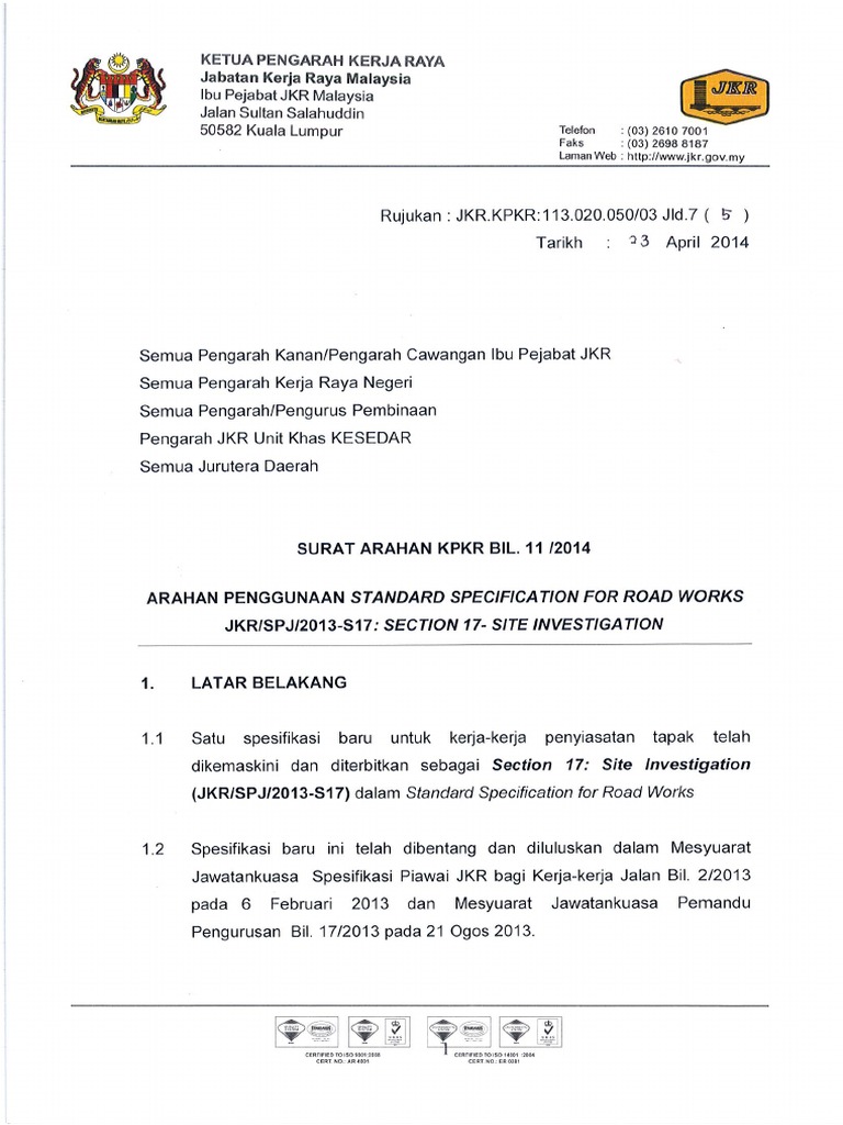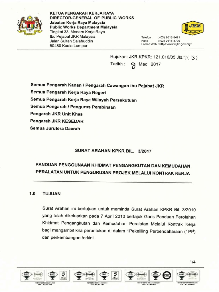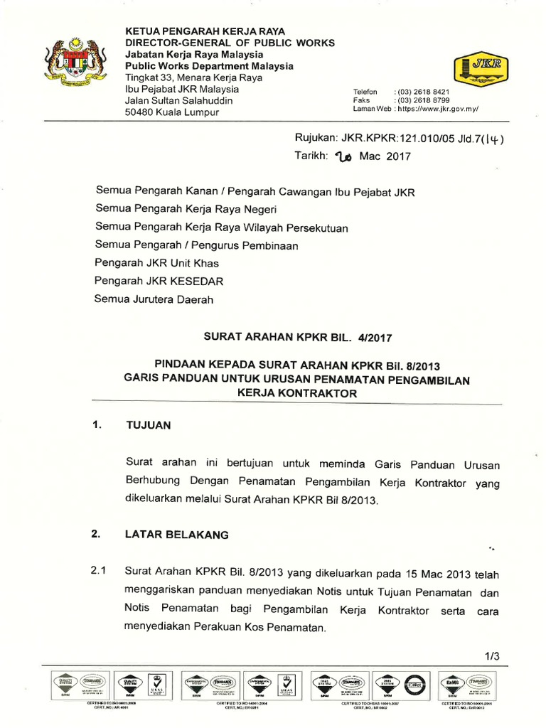 603 - 2711 3320. Surat Arahan KPKR Bil 192015 bertarikh 7102015 3. Kementerian Kerja Raya Tingkat 1-14 Kompleks Kerja Raya Jalan Sultan Salahuddin 50580 Kuala Lumpur.