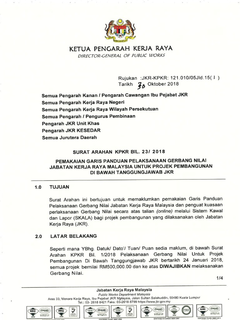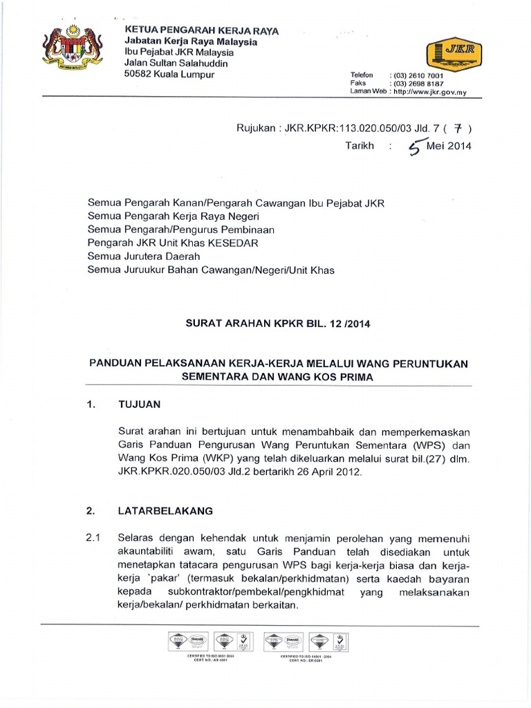 Wang Peruntukan Sementara WPS yang mana merupakan. JKR Surat Arahan KPKR Bil22020 bertarikh 17 Januari 2020-telah dikeluarkan yang mengarahkan pelaksanaan penarafan hijau bagi projek Jabatan Kerja Raya Malaysia JKRSAKPKR tersebut telah menetapkan pelaksanaan pH JKR bagi projek-projek bangunan dan jalan berdasarkan kepada jenis projek dan kos seperti berikut. Surat arahan kpkr bil42019 surat arahan kpkr bil122017.
