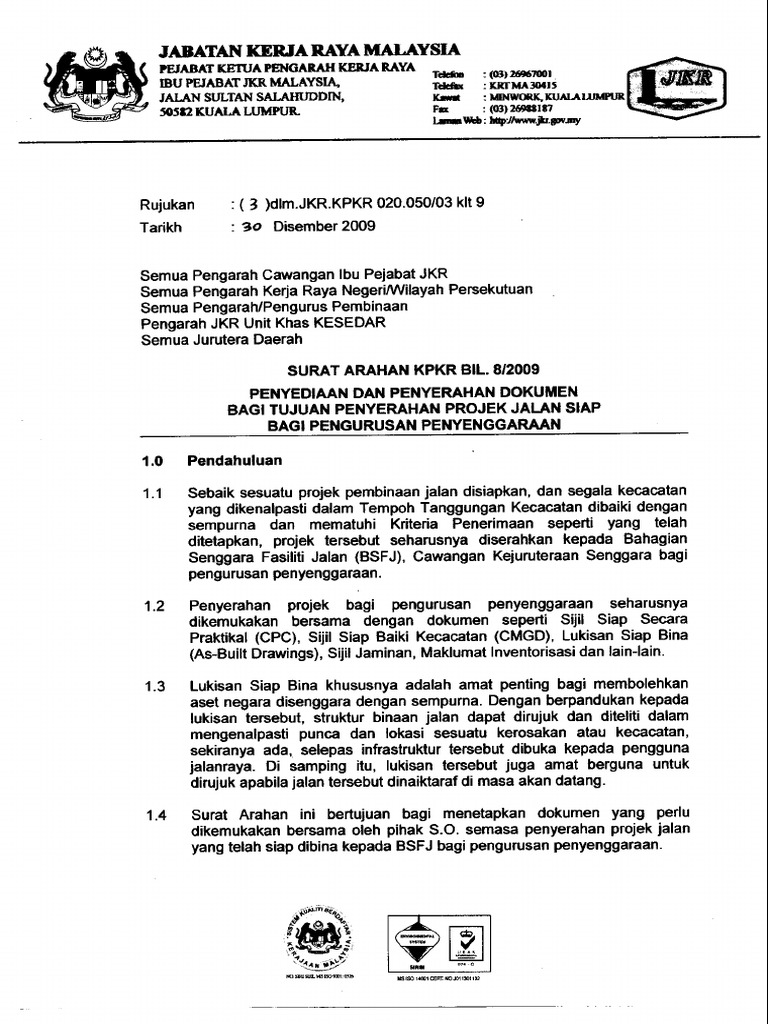 Surat Arahan Ketua Pengarah Kerja Raya Surat Arahan KPKR Bil. 62009 dan Surat Arahan KPKR Bil.